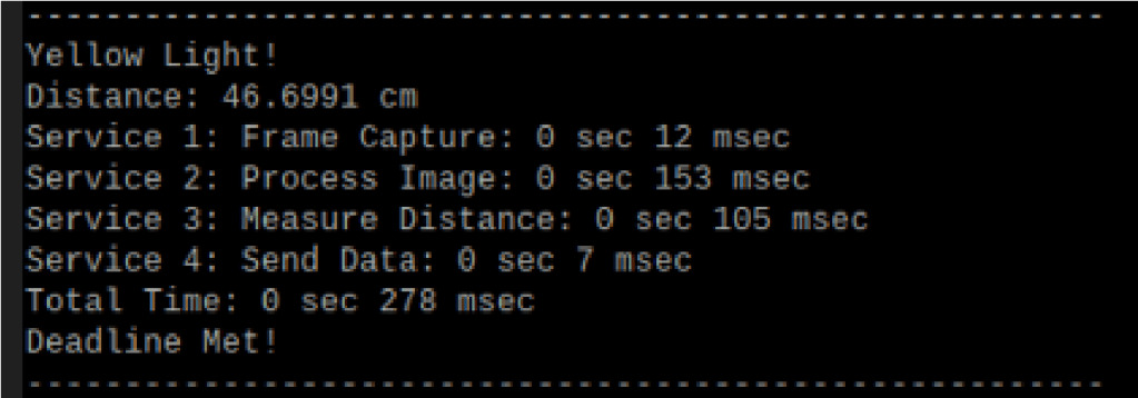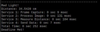 For a real life system like ours, we needed practical data to determine our deadlines. According to the National Safety Council, a lightweight passenger car traveling at 55mph can come to a halt in about 200 feet. For prototyping purposes, we scaled these numbers by a factor of 250 which means that a car going at a speed of 9.83 cm/sec requires 24 cms to stop. The distance of our camera from the signal is 35cm. At the above speed the car would require 3.55 seconds to cover this distance. Out of this time, 2.479 seconds will be spent in braking. Hence we have 1.079 seconds left for our services to execute.