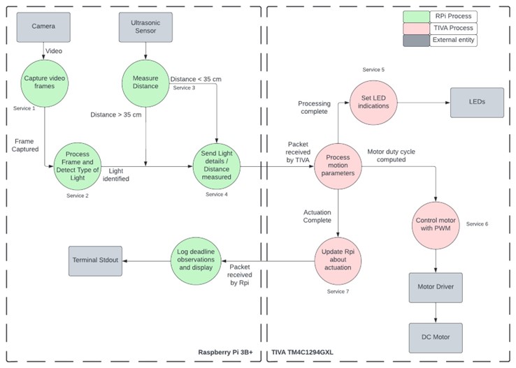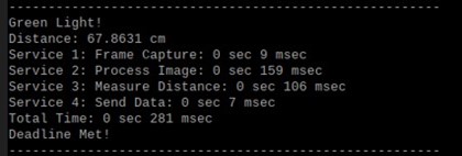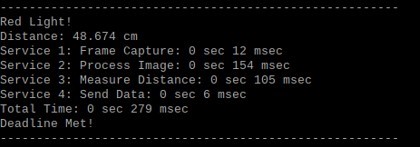 Frame capture, processing, light detection, data transmission and reception, and actuation; all these services should complete in a very specific deadline so that there is enough time (and distance) left for the car to gradually come to a full stop.