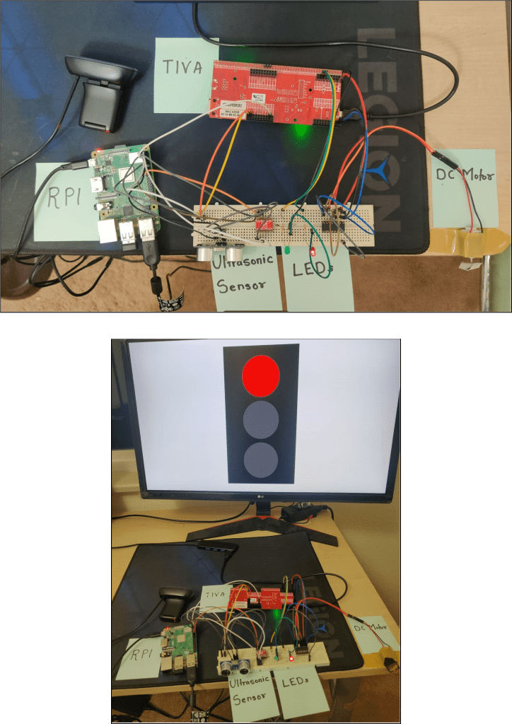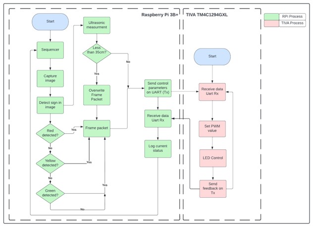 After that, we take the distance measurement from the ultrasonic sensor. If any obstacle is detected, then it will overwrite the data packet created by the image processing algorithm as a hint to the actuating microcontroller to perform immediate braking. If there is no obstacle detected, the Raspberry Pi will send the traffic light data over to TIVA using UART communication. Once the TIVA board receives the message, it will take corresponding steps to perform actuation. Once the actuation begins, the TIVA board will send an acknowledgement back to the Raspberry Pi board that the actuation has been successfully achieved. After reception of the acknowledgement message, the Raspberry Pi will log all the timings for services. This process repeats indefinitely.