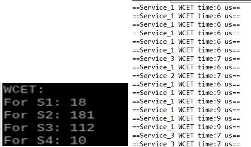 The above snapshot shows the WCET values obtained for both the boards each running their respective services for a duration of upto 5 minutes. For Tiva, we can see multiple prints of WCET as the corresponding line is printed for a service only when the new WCET is greater than the last WCET. Thus we see multiple print outputs for service 1 and 3 as their WCETs are changing with time and not for service 2.