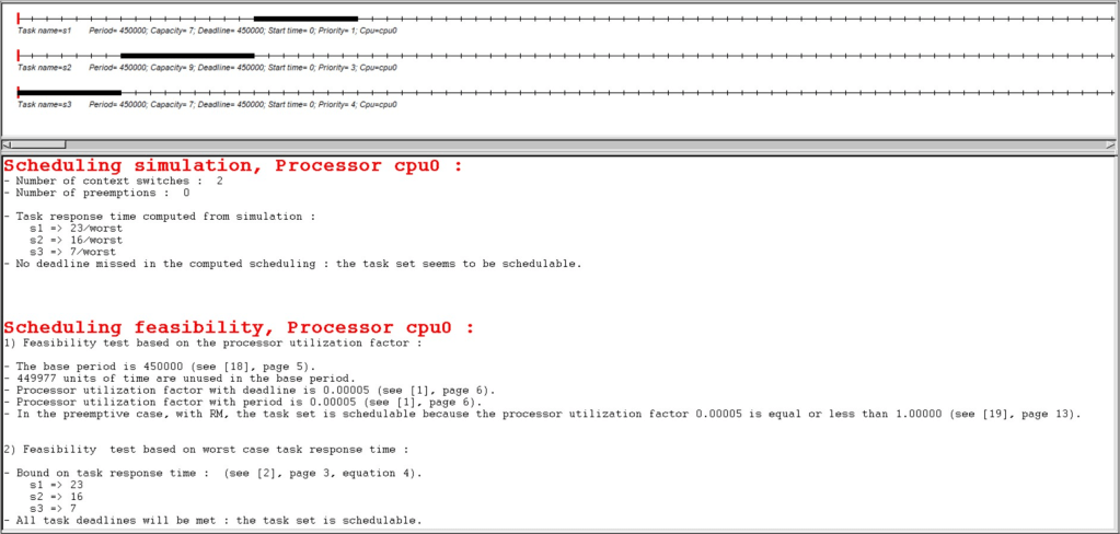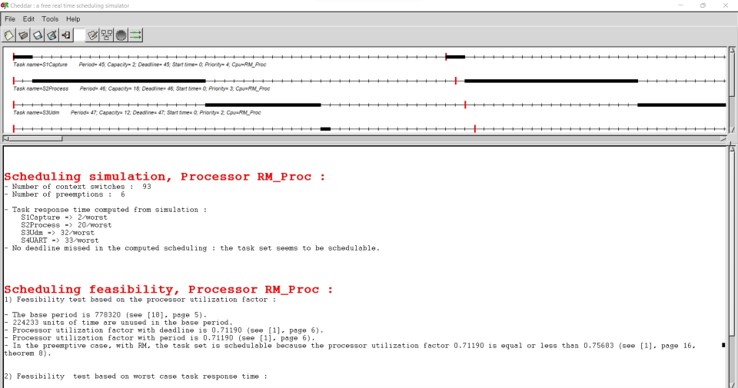 For the above screenshots of cheddar simulations we can see that for both the case of Tiva and Rpi we got the service sets as schedulable for completion point and scheduling point tests conducted on the cheddar. The utilization is also below the RM LUB condition hence the system satisfies the necessary and sufficient condition.
