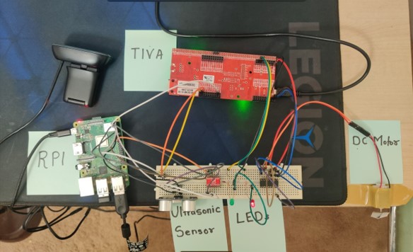 Our system uses two boards, namely Raspberry Pi 3B+ and TIVA TM4C1294GXL. All sensing part (frame capture and distance measurement) will occur on Raspberry Pi and all actuation (motor control and LED indications) will occur on TIVA board. For sensors, we are using a Logitech C270 camera and an ultrasonic sensor. These sensors will provide the data ‘sensed’ from the real world to the Raspberry Pi. The Raspberry Pi will process this data and create a small data packet which will be transferred to the TIVA board over UART communication. Once the TIVA board receives the message, it will generate a PWM signal corresponding to the data received from Raspberry Pi. This PWM signal will then be directed towards a DC motor to simulate speed control. Furthermore, the TIVA board will also actuate a couple of LEDs to indicate the status of the vehicle, whether it is running or not. The Red LED will glow if the car is stationary, and the Green LED will glow if the car is moving.